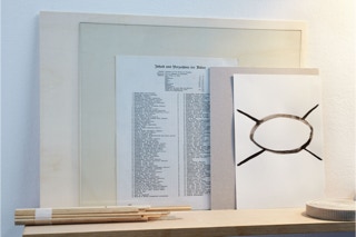 This arrangement consists of ink drawings, prints, books, sheets and shelves, a seafaring dictionary, a video, clay, glass and other various material from hardware store. This installation arose from the previous work which I developed during my stay at the former painters colony Willingshausen in 2014.